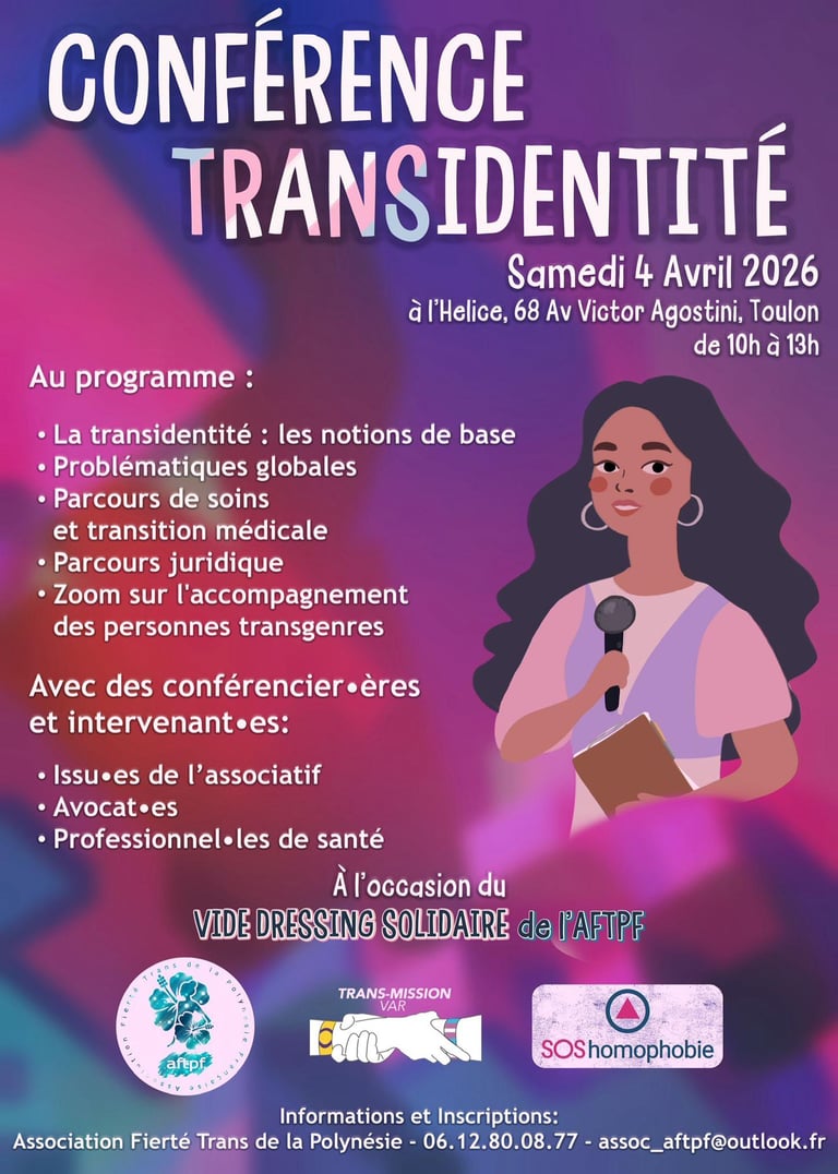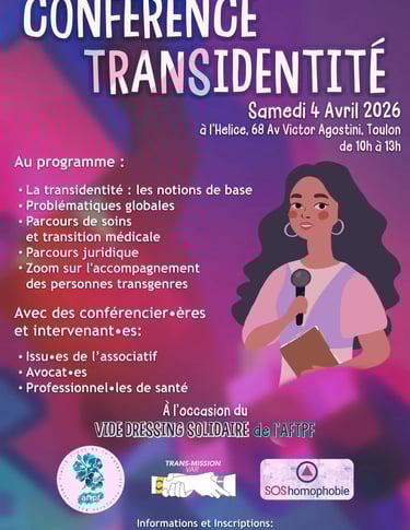 L’AFTPF, en partenariat avec les associations SOS Homophobie et Trans-mission Var, organise une conférence consacrée à la TRANSIDENTITÉ le samedi 4 avril 2026 à 10h, à la salle de l’Hélice à Toulon.