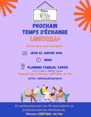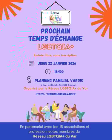 Le Groupe de Parole est de retour ce jeudi 22 janvier, à 18h, au sein du Planning Familial Varois ! N'hésitez pas à venir discuter de sujet, qui vous importe au sein d'un lieu safe avec des personnes de la Communauté LGBTQIA+ et de ses allié.e.s
